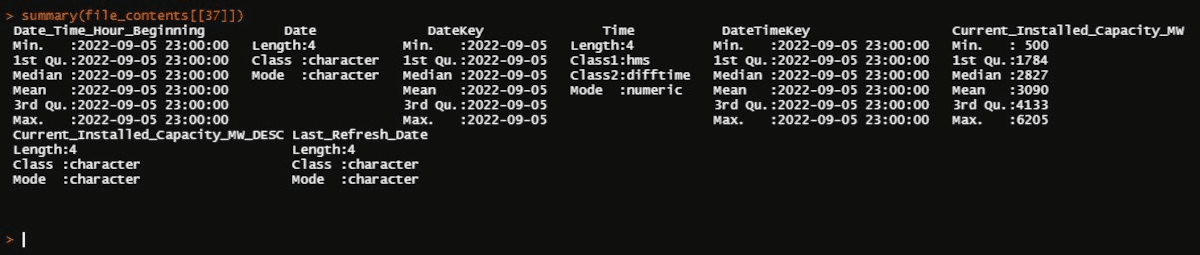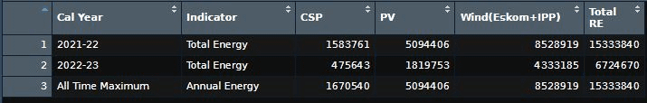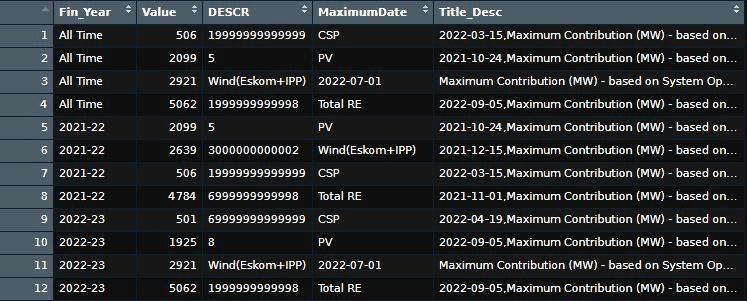 The last dataset I want to explore and present in RStudio (for now) is the latest one from Eskom that shows hourly readings since 2018. What nice about this is that it only looks at renewable energy and it introduces smaller categories that can be explored later.