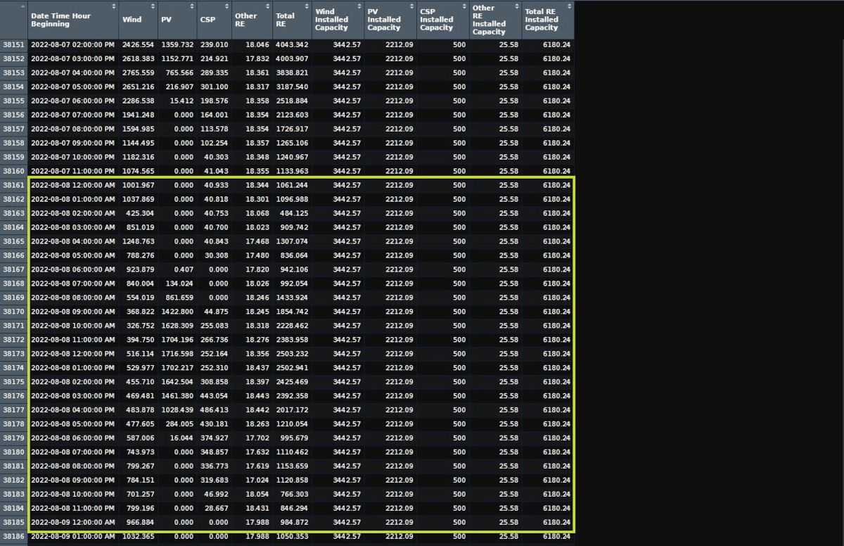 `Date Time Hour Beginning` Wind PV CSP `Other RE` `Total RE` `Wind Installed Capacity` `PV Installed Capacity` `CSP Installed Capacity` `Other RE Installed Capacity` Total RE Installed Capa…¹