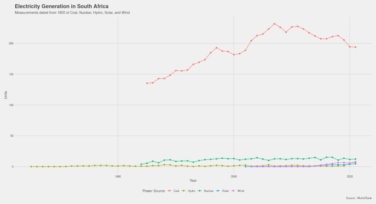 labs(title = "Electricity Generation in South Africa", subtitle = "Measurements dated from 1900 of Coal, Nuclear, Hydro, Solar, and Wind", x = "Year", y = "Units", color = "Power Source", caption = "Source : World Bank") +