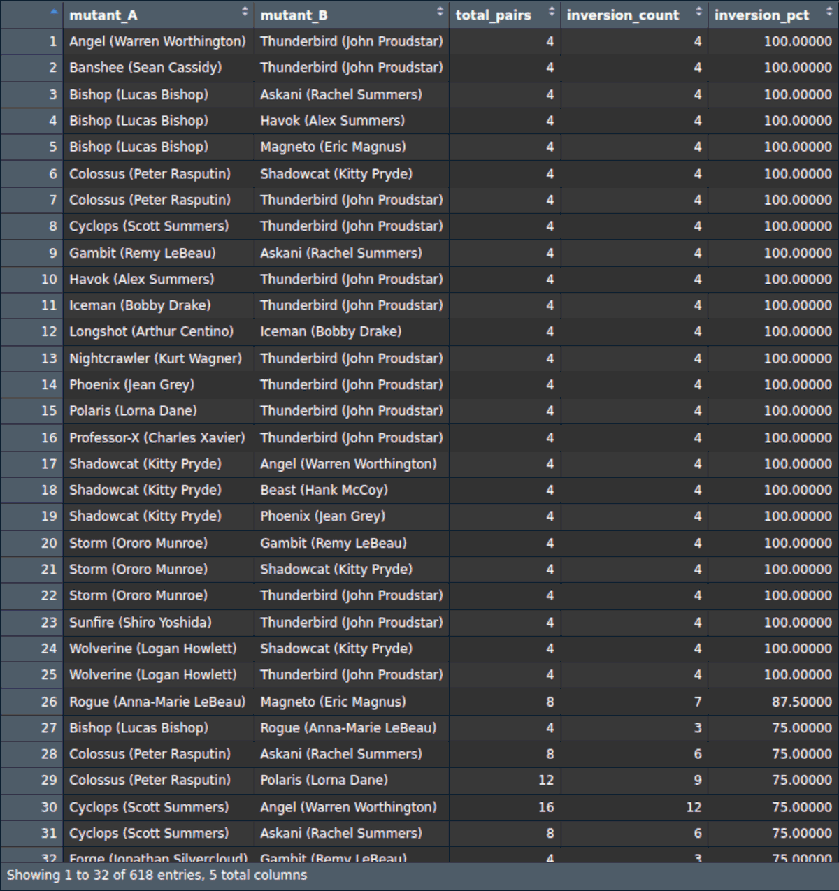 The little discoveries I made towards the end of this project reignited an excitement to continue exploring. Some really interesting tables came out of the pairwise comparisons, and I think it further reinforces this other idea I had at the start about making this a narrative game rather than a straight-up brawl scenario. The data can create some unexpected prompts and the still ends up following the “lived” history of the X-Men comic books.