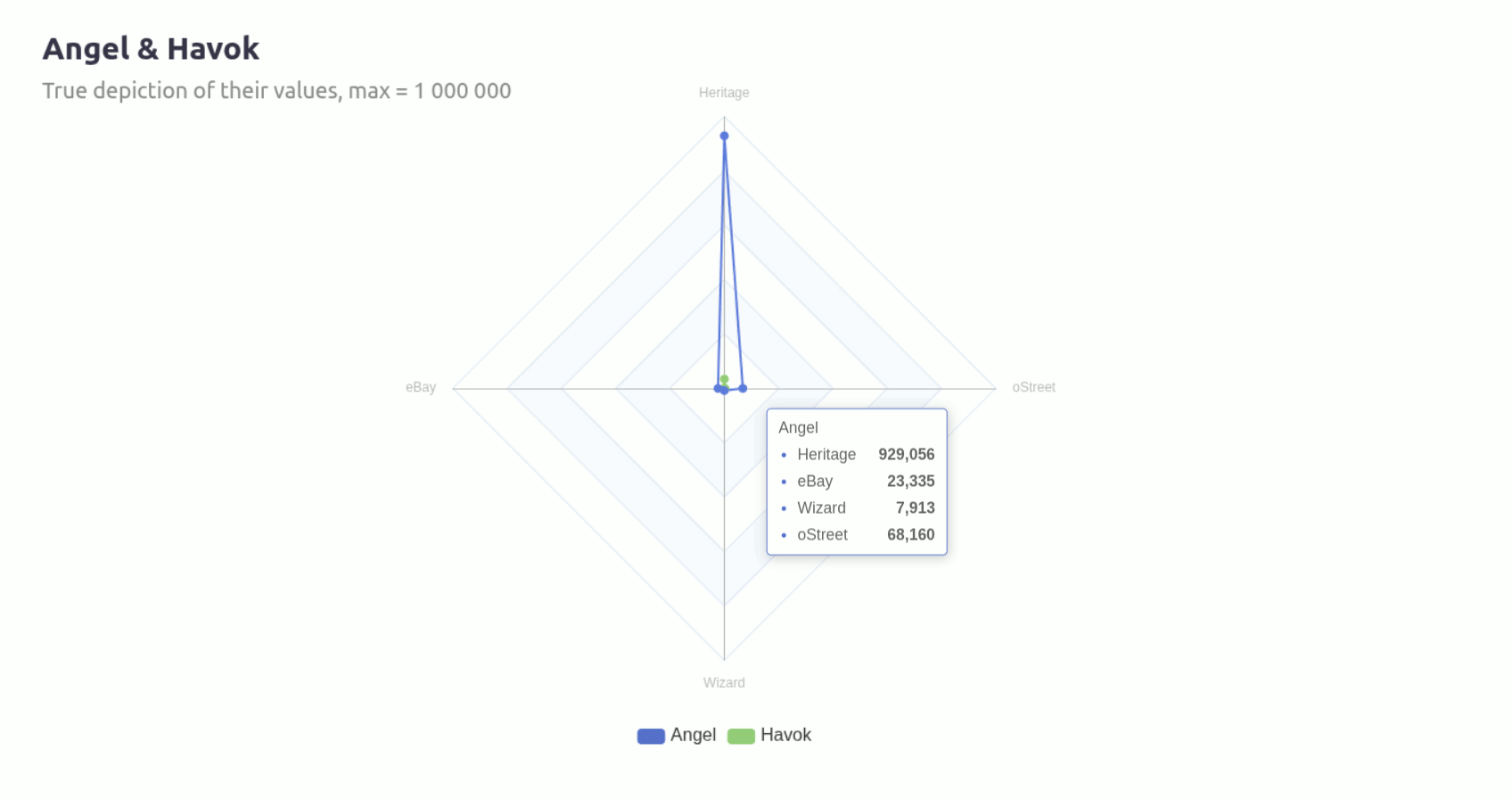 Built with vanilla ECharts4R, here’s a simple radar chart mapping Angel and Havok’s values: