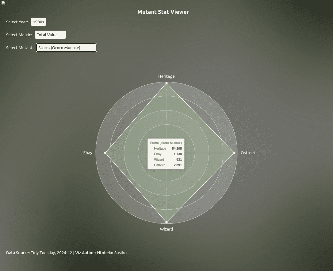 My approach going into this project was to look at this as an opportunity to see how far I could push my visualizations. There was a plan to make custom icons that would appear when the corresponding mutant was selected, giving it a video game character selector look, but I had greatly underestimated the mechanics just needed to get a dual radar of this complexity working. This would have been a “system within a system” problem I look forward to tackling in a future project.