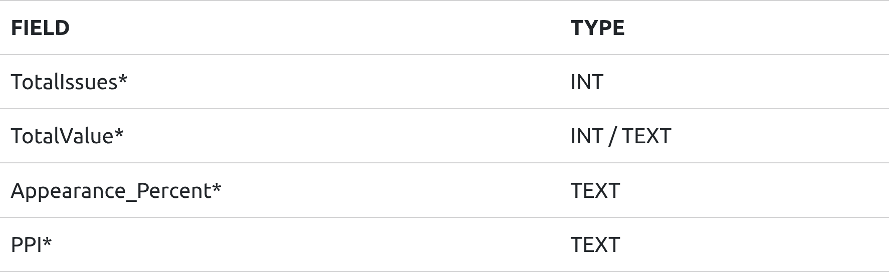 Something I noticed while inspecting the columns is that some value columns were NUMERIC/INTEGER as expected, but other value columns were designated TEXT/STRING.