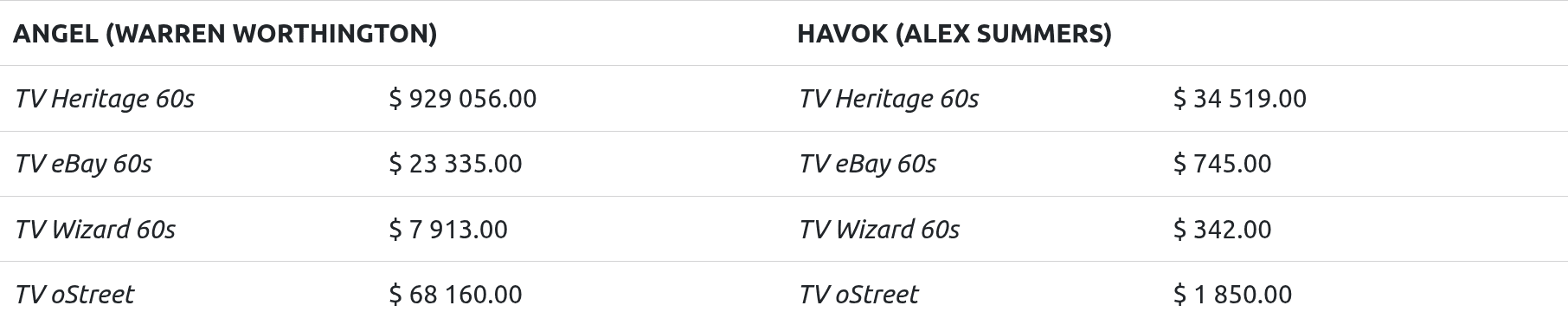 After looking at the raw data, I chose to focus on basing my use of the metrics only on revenue and secondarily on the value of a single issue as a unit price for each mutant. Rather than coming up with definitive picks, my focus is to present the tabular data in a way that makes it easier to visually compare potential match-ups by looking at mutants’ performances in the different outlets.